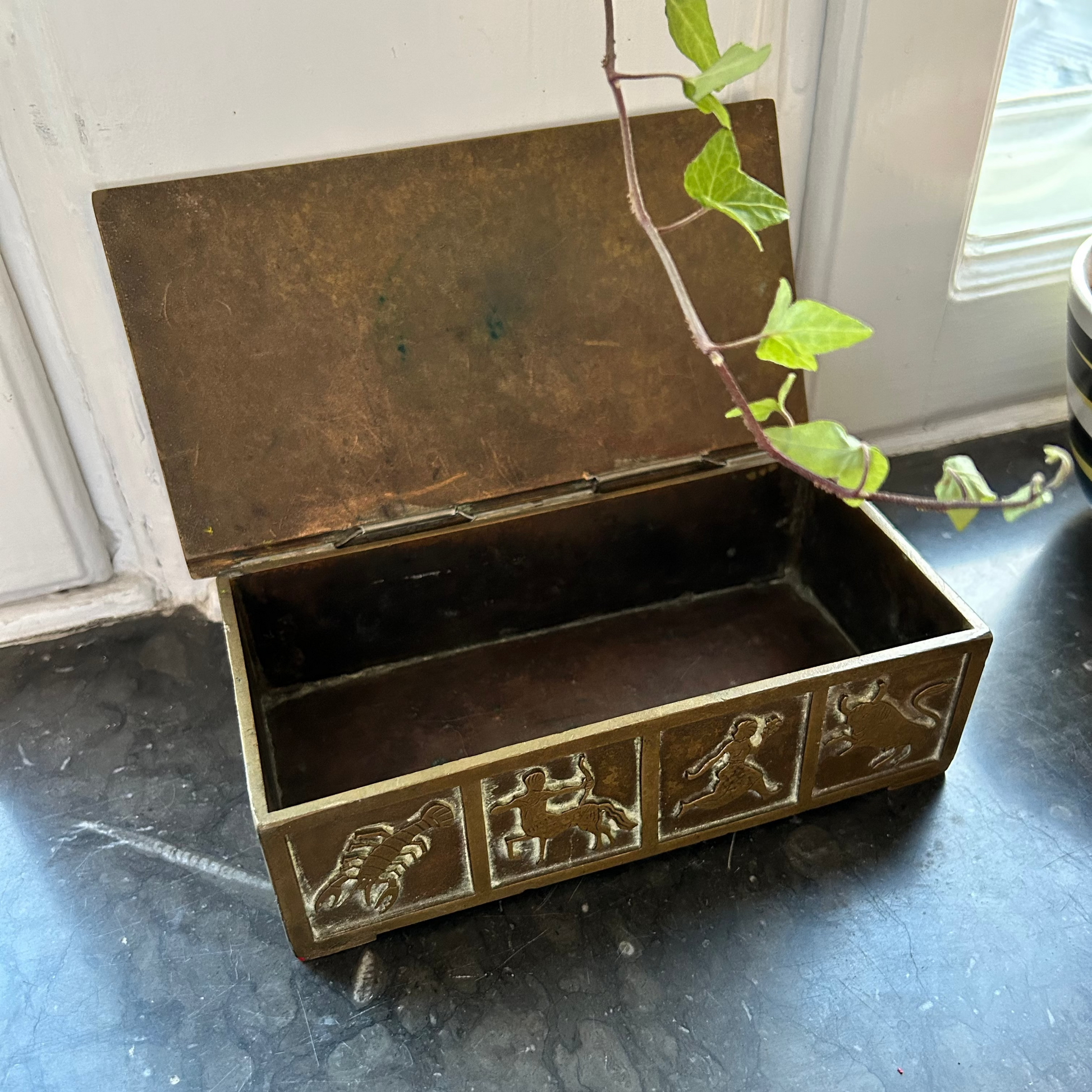 This beautiful vintage bronze box from E. Dragsted features all the zodiac signs in detailed relief. Measuring 19 x 10 cm with a height of 5.5 cm and weighing 1215 grams, this sturdy box combines exquisite craftsmanship with a unique astrological design, making it both a decorative and functional collector’s piece.