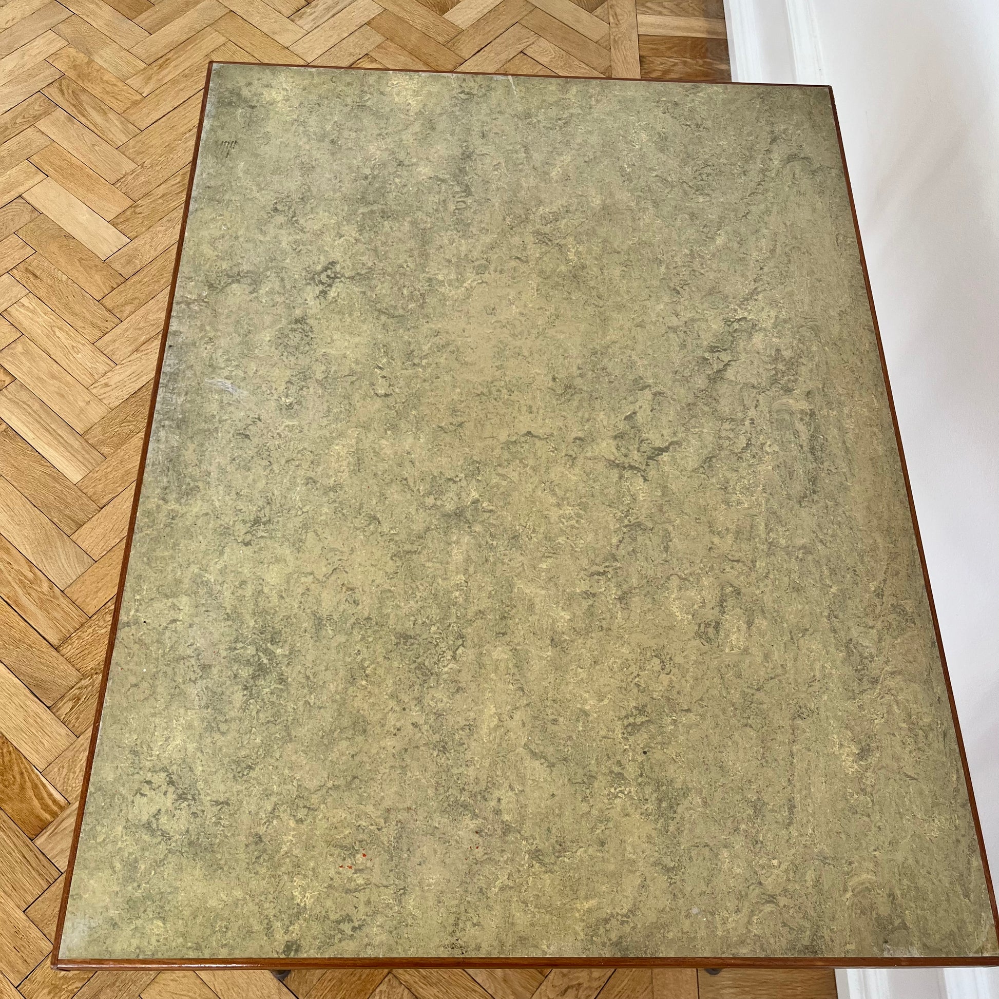 A charming and practical piece of mid-century design, this vintage Danish table features a durable, light-toned laminate top paired with slender, black metal folding legs. The minimalist frame and functional folding mechanism make it ideal for small-space living, studio workspaces, or as a stylish occasional table.