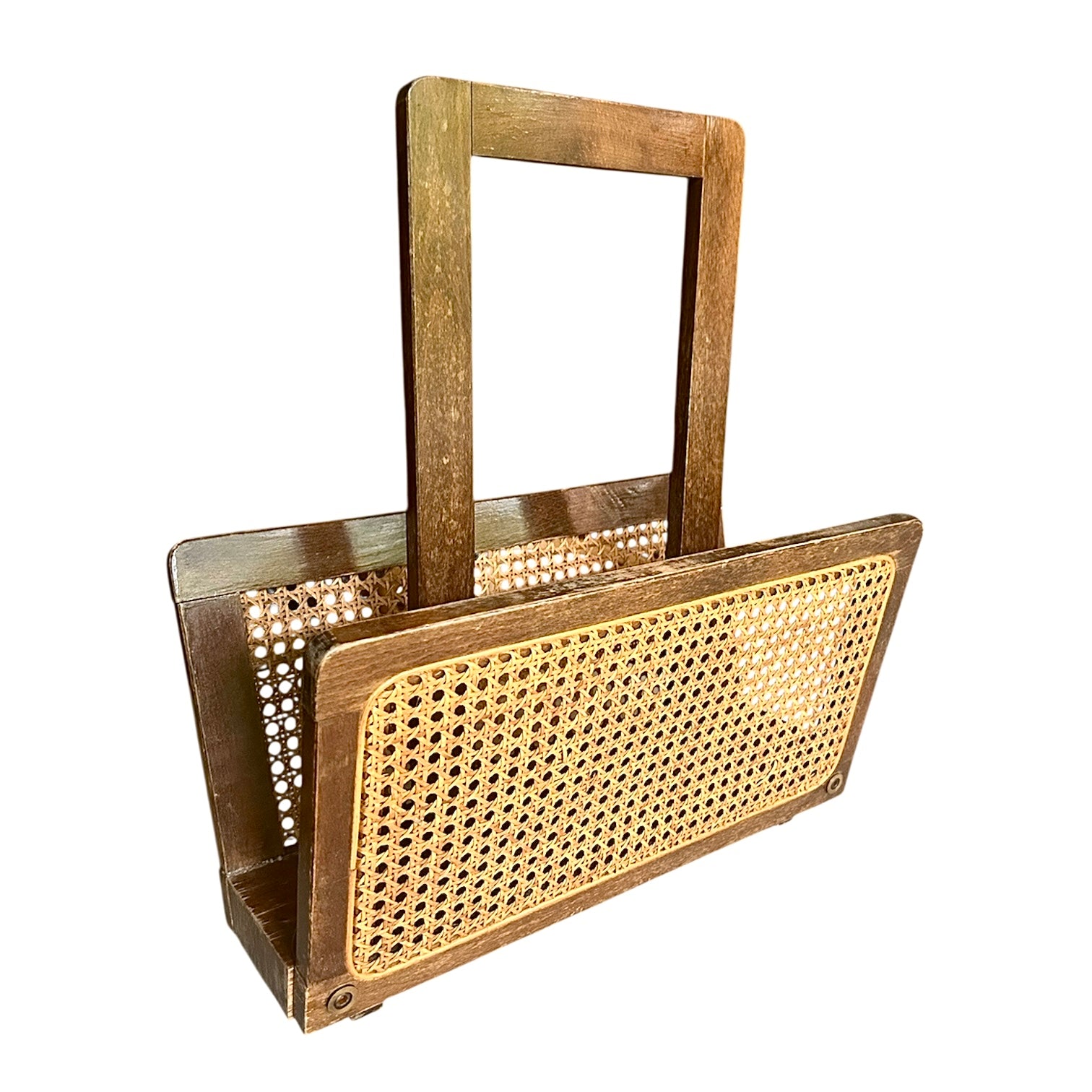 This Italian wood and woven cane magazine rack combines traditional craftsmanship with elegant design. Crafted from high-quality wood and natural cane, it offers sturdy support while adding a touch of warmth and texture to any room. Its lightweight yet durable construction makes it easy to move, providing a stylish and practical solution for organizing magazines and newspapers. Ideal for those who appreciate refined materials and timeless Scandinavian-inspired aesthetics.
