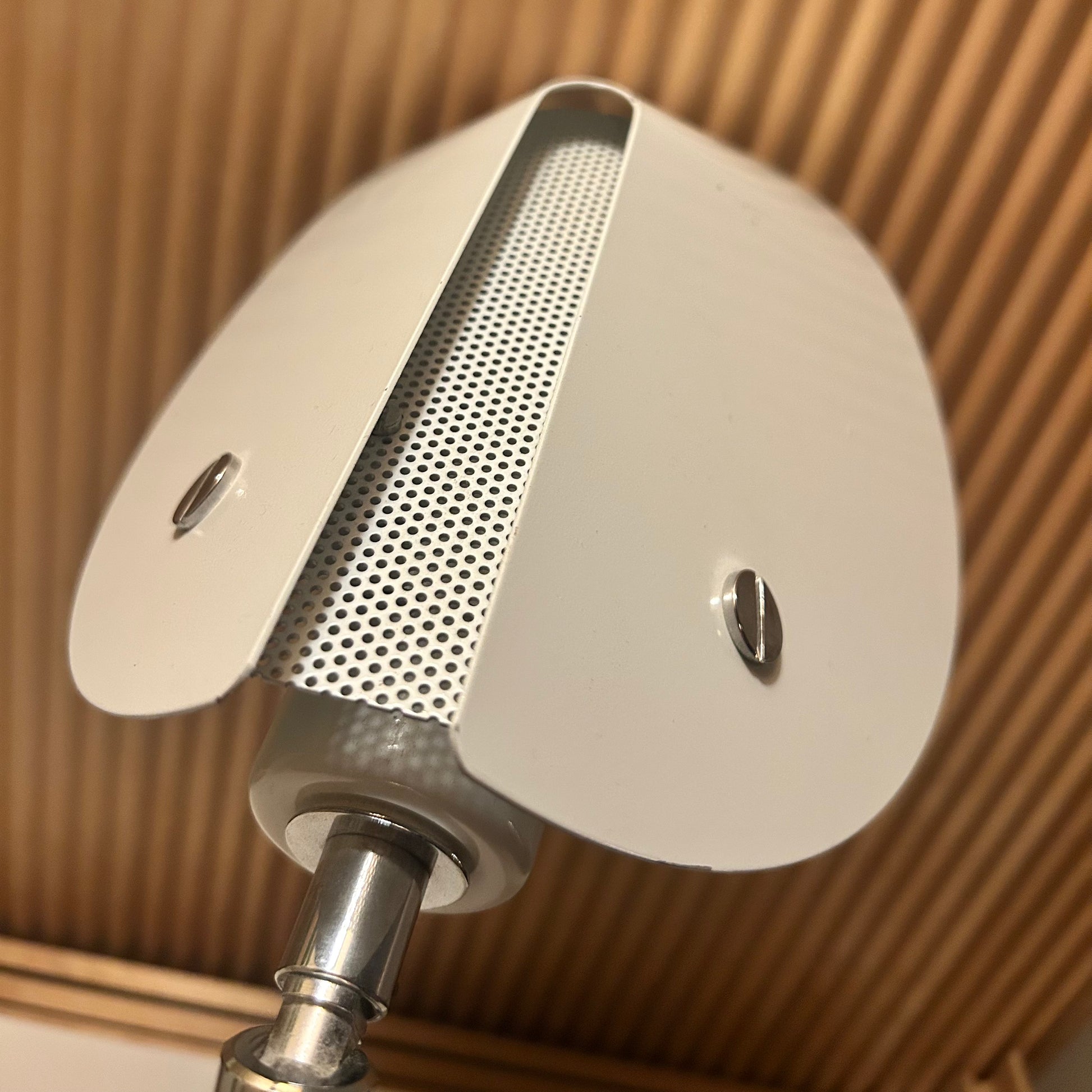 Crafted from metal with a shiny chrome finish, the lamp reflects the bold yet understated aesthetics of the 1970s. Its clean lines and geometric form make it a versatile piece that works equally well on a desk, side table, or nightstand.